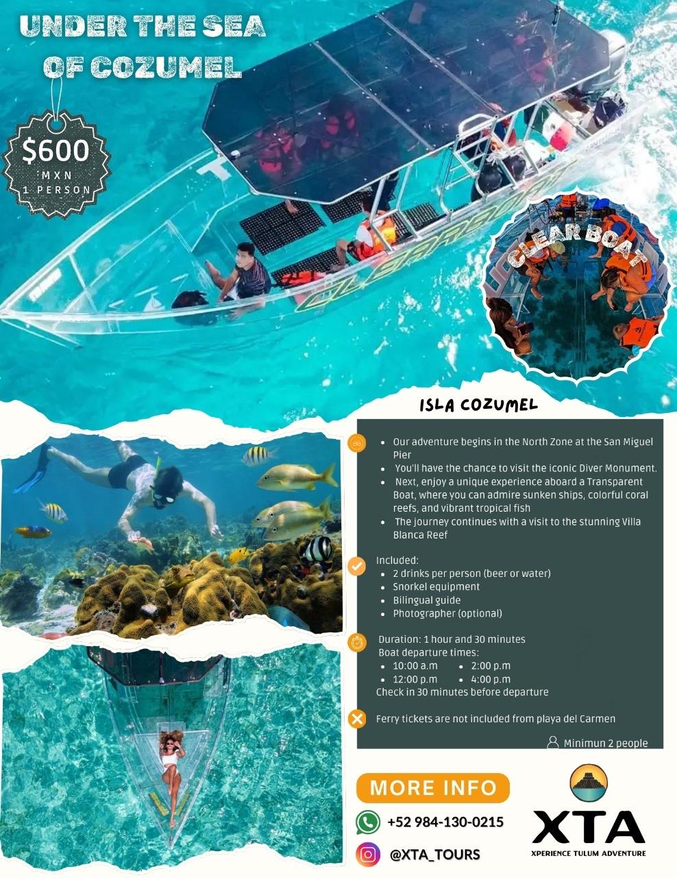 Discover the beauty of Cozumel like never before aboard a fully transparent boat, offering a unique window into the Caribbean Sea.